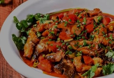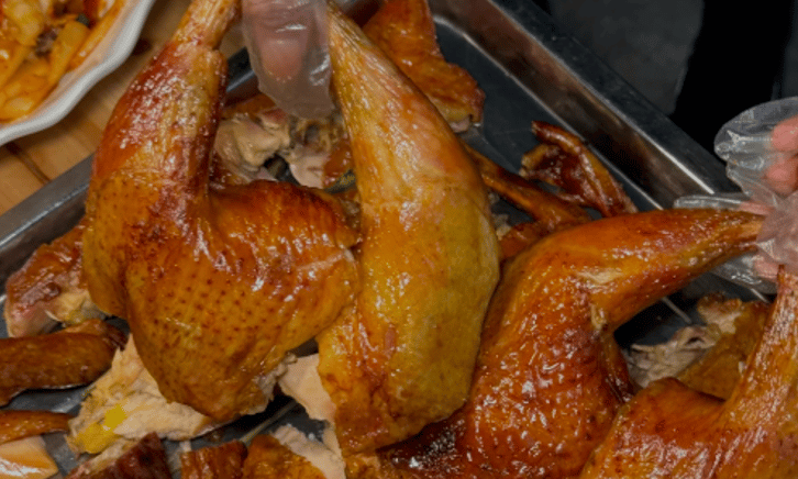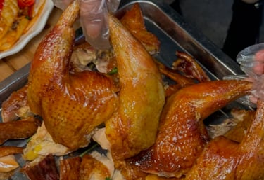 Clay Oven Chicken: Freshly killed and roasted, crispy outside and tender inside.