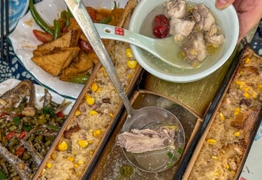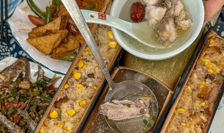 is a flavorful reflection of its ethnic diversity. The signature dish is Bamboo Tube Rice, where sticky rice, cured meat, and beans are roasted in fresh bamboo for a smoky aroma. Another highlight is Longsheng Oil Tea, a UNESCO-recognized intangible heritage. This "liquid gold" is made by frying tea leaves with ginger and garlic, then served with crispy popped rice and peanuts. These dishes, along with organic mountain vegetables and Longji Rice Wine, offer a healthy, earthy taste of the highlands.