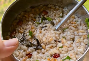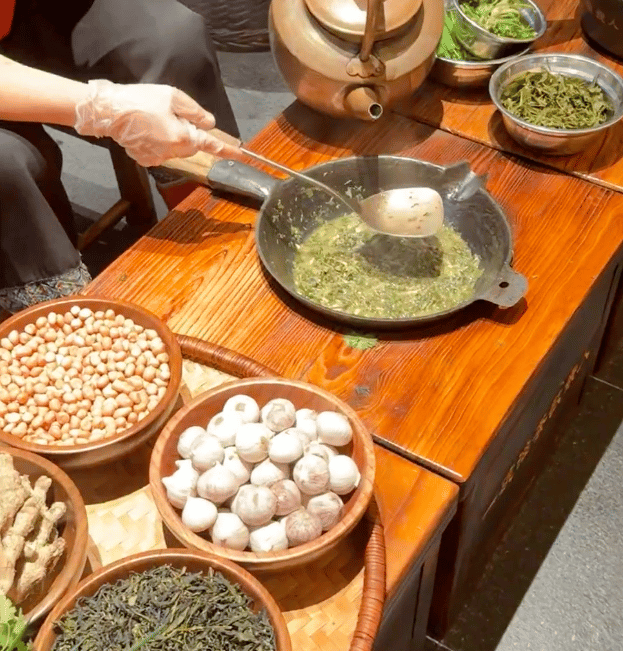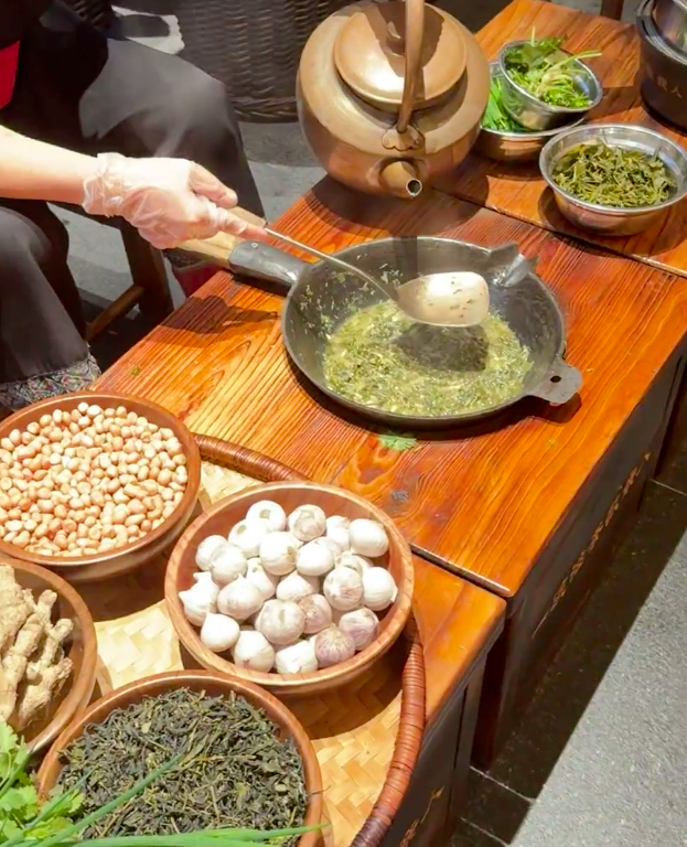 In the mist-shrouded Longji Rice Terraces, Longsheng Oil Tea (龙胜油茶) is more than a beverage—it is a cornerstone of the Guangxi minority culture, particularly for the Yao and Dong people. Often called "Chinese coffee," this traditional brew is a centuries-old remedy for the humid mountain climate, known for its medicinal and revitalizing properties. Learning to make Oil Tea is a rhythmic, sensory experience. You begin by "frying" tea leaves in a cast-iron wok with ginger, garlic, and scallions, using a wooden mallet to crush the mixture until the oils release a fragrant, toasted aroma. Boiling water is added to create a golden, savory broth. The final bowl is a customized masterpiece, topped with crispy puffed rice, fried soybeans, and peanuts. To sit with a local family and master this craft is to taste the literal "roots" of the mountain, blending culinary skill with a deep sense of community and history.