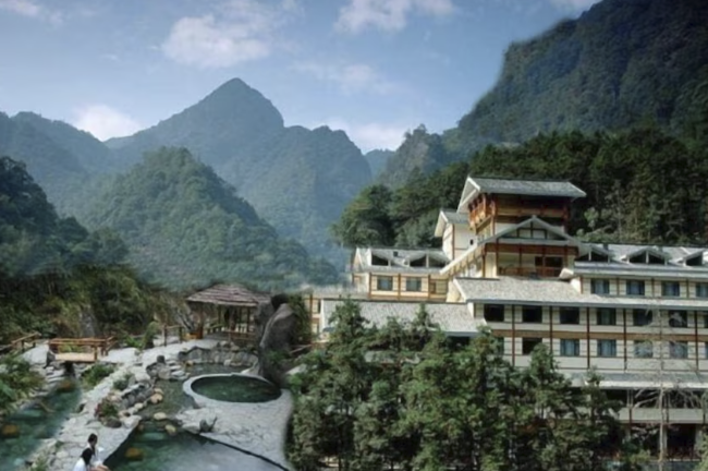 Located within the lush National Forest Park, Longsheng Hot Spring Hotel is a premier wellness retreat famed for its "holy water". The resort features sixteen open-air and indoor pools filled with natural spring water rich in minerals like zinc and lithium, maintaining a constant temperature between 45°C and 58°C. Surrounded by dense emerald forests and misty mountains, the hotel provides a tranquil escape from urban life.