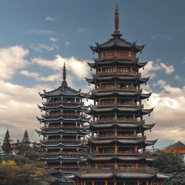 Its seven-story companion is finished with white glazed tiles, emitting a cool, silver light that embodies "Yin" and the serenity of the moon.