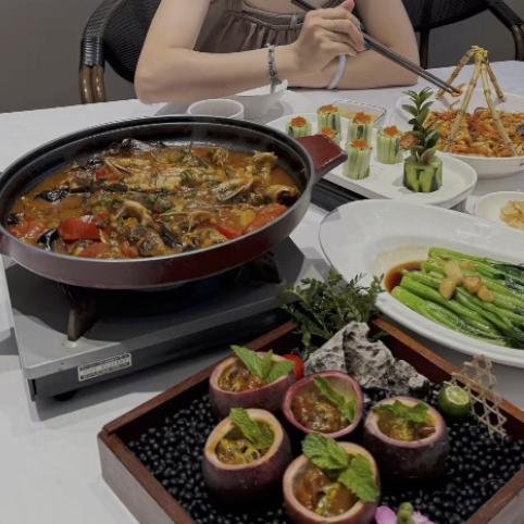 A hidden gem in Yangshuo, Yixia Tang Private Cuisine serves authentic Guangxi and local flavors with homemade warmth. Using fresh, seasonal ingredients sourced from nearby farms, the restaurant crafts classic dishes like Yangshuo Beer Fish (tender carp braised in local beer with herbs), Stuffed River Snails (minced pork mixed with mushrooms stuffed into snail shells), and Lipu Taro Braised Pork (soft taro absorbed with savory pork sauce). Other highlights include bamboo shoot stir-fry and osmanthus glutinous rice cakes.